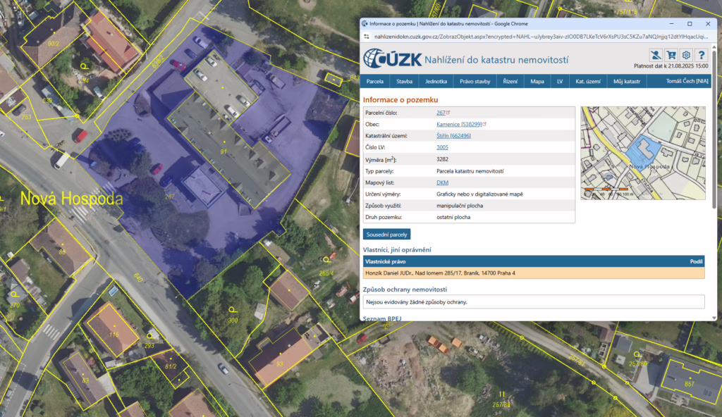 Snímek obrazovky z dálkového přístupu do veřejného seznamu – katastru nemovitostí.