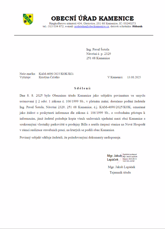 Nechci šířit spekulace. Snažil jsem se tedy získat dokumenty, ptal jsem se. Zastupitel Pepa Dvořák mi prozradil, že mu bylo panem starostou řečeno, že je to v pořádku, protože obec výměnou za to dostane část pozemku, kde je autobusová zastávka. Písemnou informaci ani rozhodnutí zastupitelstva jsem nebyl schopen nikde najít. Dotázal jsem se tedy i ostatních zastupitelů – ti o projednávání investice obecních peněz do soukromého majetku nevěděli nic. Pavel Šotola tedy poslal na obec dotaz, dle zákona 106/1999 Sb. o svobodném přístupu k informacím, s otázkou, zda existuje jakékoliv smluvní ujednání mezi majitelem nemovitosti a obcí. Odpověď: obec žádnou takovou smlouvou nedisponuje.