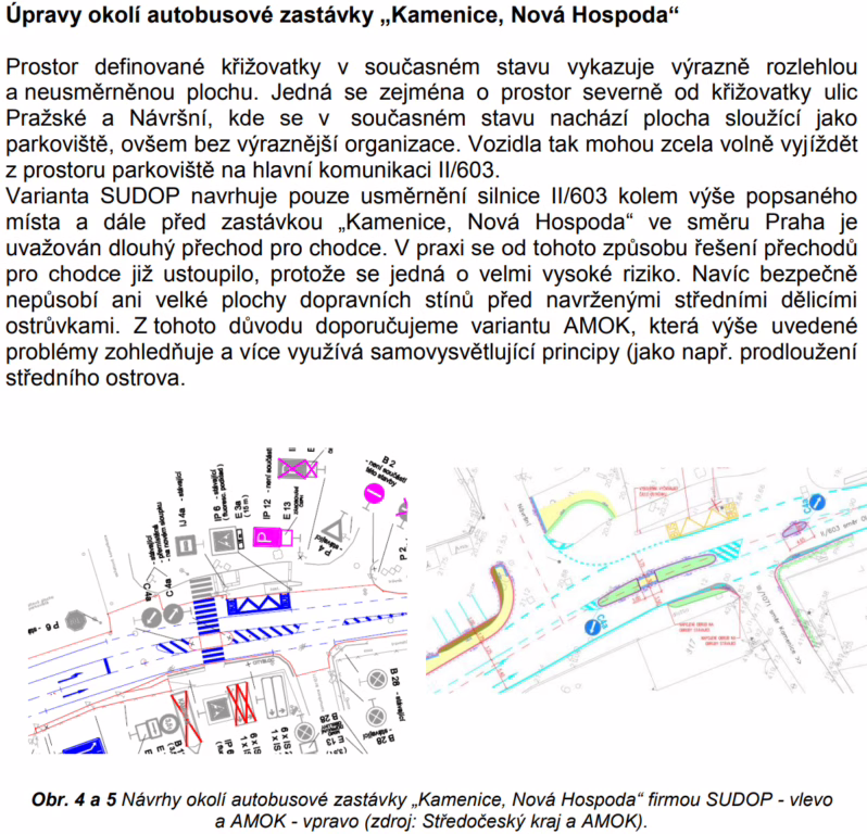 Bezpečnostní posudek ČVUT. Doporučené řešení je vpravo. Podívejte se na pozici zastávek v dostupných dokumentech. V žádném z navrhovaných řešení není zastávka posunována směrem k pumpě a zastávky nejsou umístěny proti sobě. Doporučením bezpečnostního auditu bylo zastávku pouze podélně posunout a udělat úpravy středového ostrůvku a místa přecházení chodců. Obec tedy udělala něco úplně jiného, než jí odborníci doporučili. Proč?