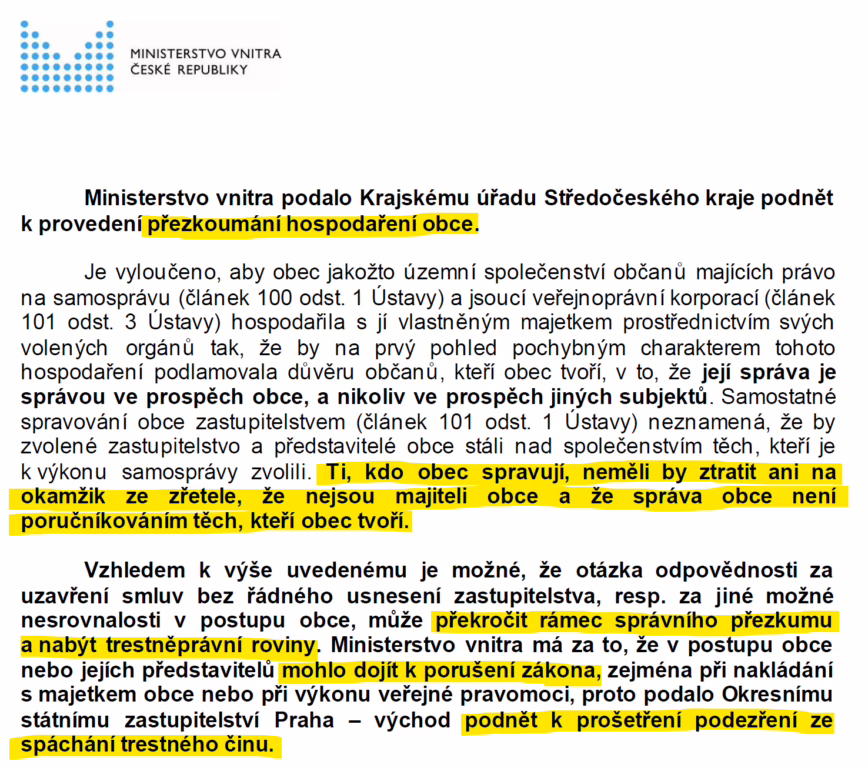 | Ministerstvo vnitra jen přehodilo problém na jiné orgány. | Ministerstvo vnitra, jeho odborníci a právníci, svým interním šetřením došli k jednoznačným závěrům. Skrytý dar a podezření ze spáchání trestného činu. Další postup MV je naprosto standardní – podnět na státní zastupitelství k šetření podezření ze spáchání trestného činu radou obce a podnět na krajský úřad k šetření hospodaření obce a nezákonného poskytnutí daru soukromému subjektu. Trestné činy musí prověřit státní zastupitelství. Stejně tak kontrola hospodaření obce spadá do kompetence krajského úřadu. To nemůže dělat MV. MV si tak „neumylo ruce“, jak to bagatelizuje paní Boukhemisová, ale zvolilo jediný správný postup při tak závažném podezření, ke kterému ve svých závěrech jasně a transparentně dospělo. |